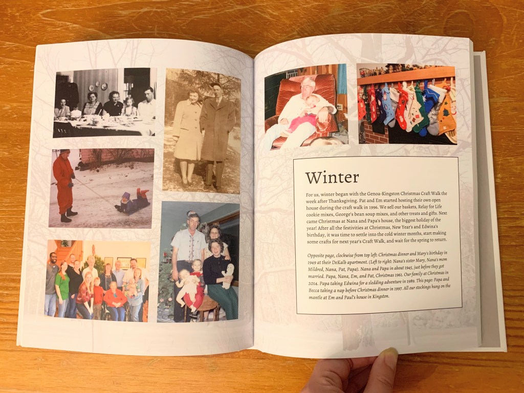 Include photos! I included as many photos as I could, including old and new family photos, photos of us cooking, and photos of the dishes. Photos of the dishes help to identify it and help the cook recreate how it’s supposed to look when they make it on their own. Whenever you make a dish, take a clear, well-composed photo of the dish. If I didn’t have a photo of the completed dish, and if there was room on the page, I tried to include a photo of the family member who originally made that recipe. On the introductory pages for each chapter (such as the Winter section below), I included a variety of old and new family photos, much like a family photo album. Younger family members loved flipping through the book to find photos of themselves and their parents when they were young!