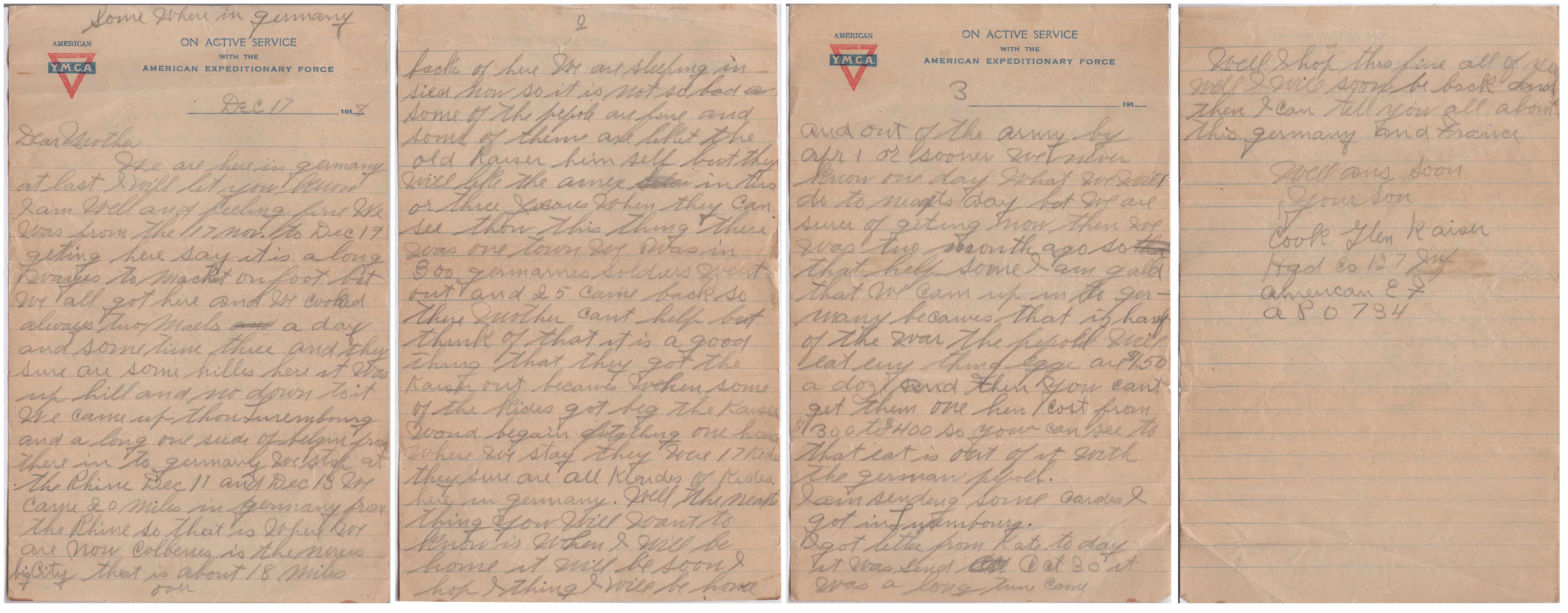 back of here. We are sleeping inside now so it is not so bad. Some of the people are fine and some of them are like the old Kaiser himself but they will like the Amex in two or three years when they can see through this thing. There was one town we were in that 300 German soldiers went out and 25 came back so their mothers can’t help but think of that. It is a good thing that they got the Kaiser out because when some of the kids got big the Kaiser would begin fighting. One house where we stayed there were 17 kids. There sure are all kinds of kids here in Germany. Well the next thing you will want to know is when I will be home. It will be soon I hope. I think I will be home