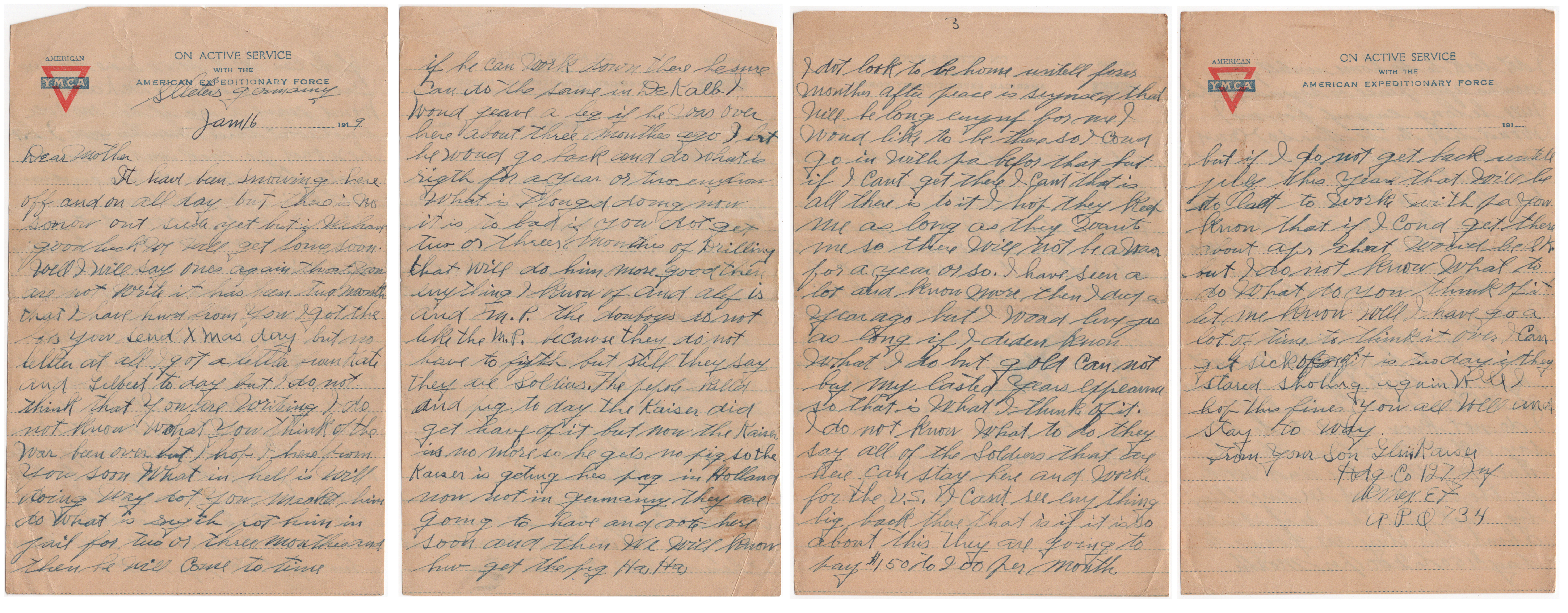 If he can work down there he sure can do the same in DeKalb. I would give a leg if he was over here about three months ago. I bet he would go back and do what is right for a year or two. Anyhow what is Floyd doing doing now? It is too bad if you don’t get two or three months of drilling. That will do him more good than anything I know of and Alfred is an M.P. The doughboys do not like the M.P. because they do not have to fight but still they say they are soldiers. The people killed and pig today. The Kaiser did get half of it but now the Kaiser is no more so he gets no pig so the Kaiser is getting his pig in Holland now not in Germany. They are going to have a vote here soon and then we will know how we will get the pig. Ha, Ha.